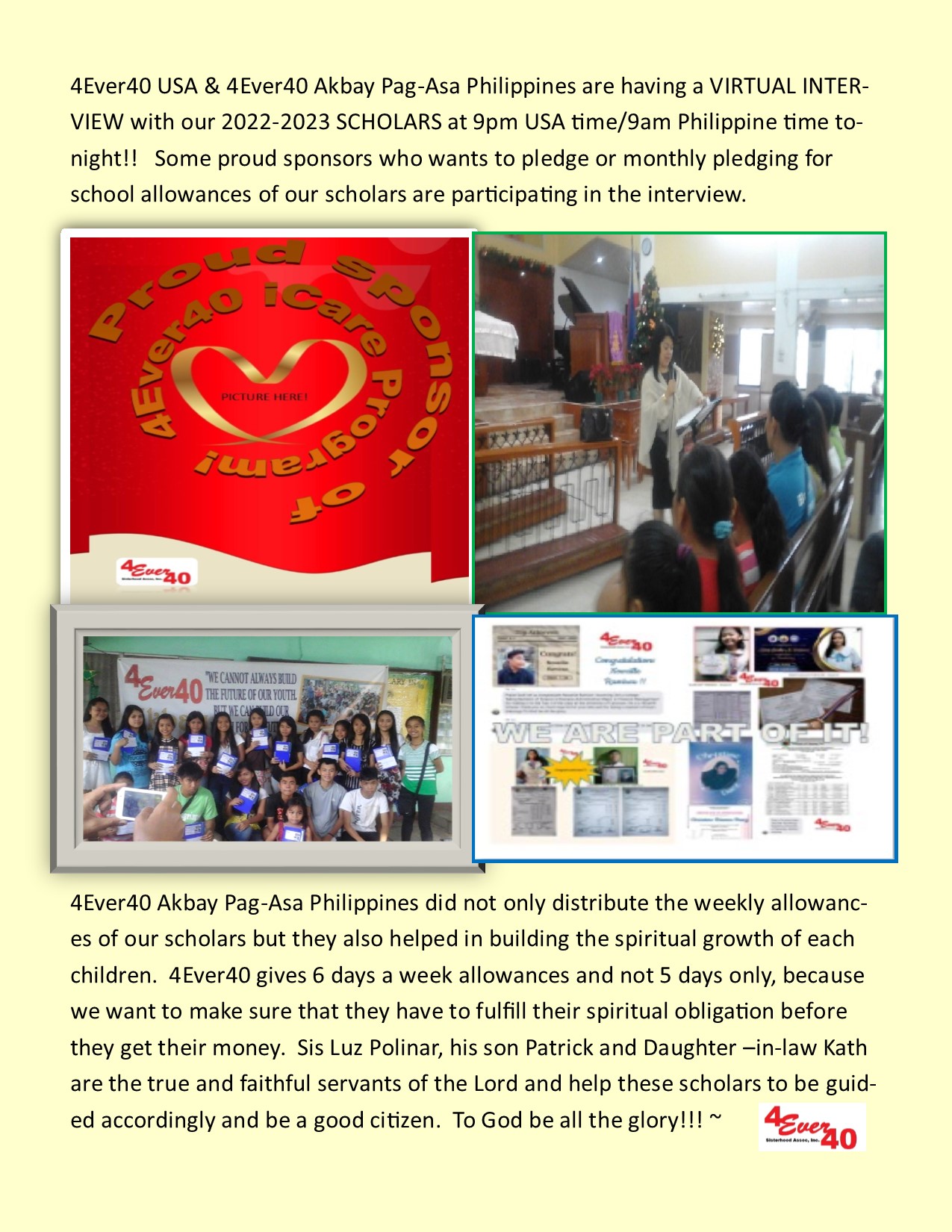 Charities – 2023 4Ever40 continued giving weekly allowances to our scholars after attending after service fellowship to mold their spiritual and empower them to become a better person. Sunday school class for the scholars by Patrick & Kath Polinar